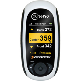 Celestron CoursePro Golf GPS CoursePro is a line of GPS devices that assist golfers on the golf course. The LCDs display distances to the front, center and back of the green for each hole along with the par. The devices calculate your shot distance and are backlit for viewing in low light. The information provided by each CoursePro GPS product gives the golfer up to the minute accurate, crucial information that will guarantee a competitive edge.