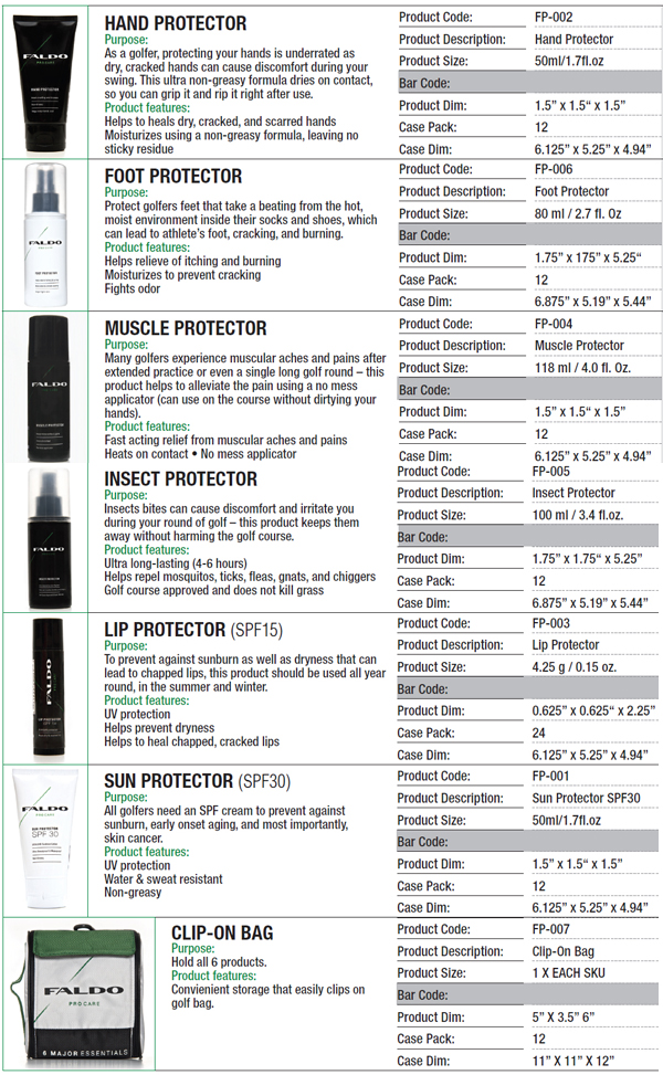 Faldo Pro Care Personal care product range inspired and developed by the major champion Faldo ProCare, a range of personal care products, developed in collaboration with the six-time major champion, built around products that fight UV damage, will include an SPF sun screen, SPF lip balm, repairing hand cream, anti-fungal foot spray, insect repellent and muscle pain relief cream, all designed with golfers and sportsmen in mind. The products are be available in a full-collection all-in-one carrying case with the Faldo name, which easily clips to a golf or equipment bag. Sir Nick Faldo, the former #1 golfer in the world, is the winner of 6 Major Championships. His Faldo Enterprises are more involved in the business of golf than ever before. Faldo Design has a complete portfolio of 26 critically acclaimed course and currently has 14 courses in development.