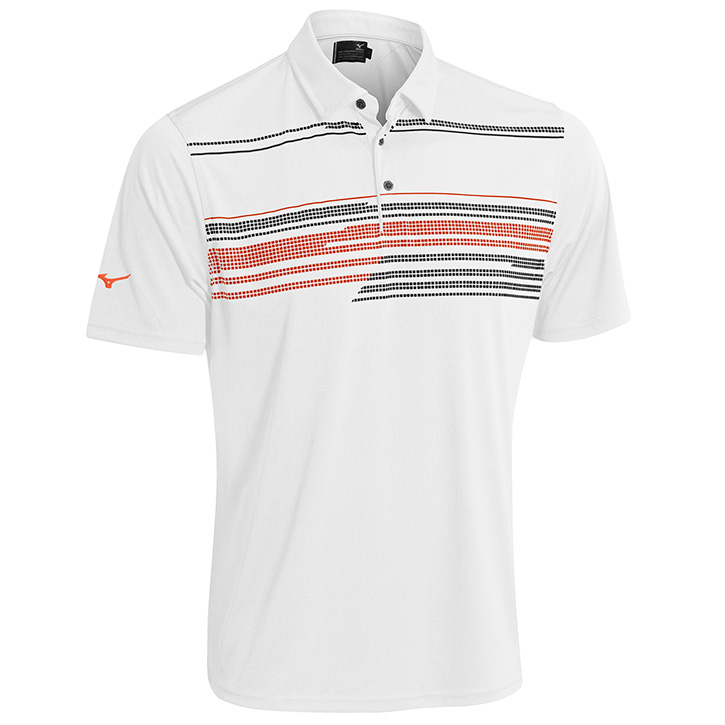 Mizuno Screen Print Broken Chest Stripe Polo - WhiteThe mosaic print stripe provides a modern and sporty appearance. Mizuno DryLite moisture management polyester yarn keeps the body dry, maintaining core body temperature.