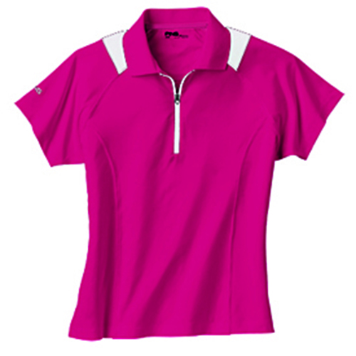 Ping Ladies Camber Polo *Color block zip front placket polo. *Contrast piecing at top of shoulder and contrast zipper at front with slef fabric collar. *P3 fabric technology. *100% Performance Polyester. Sizes S-XXL |