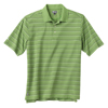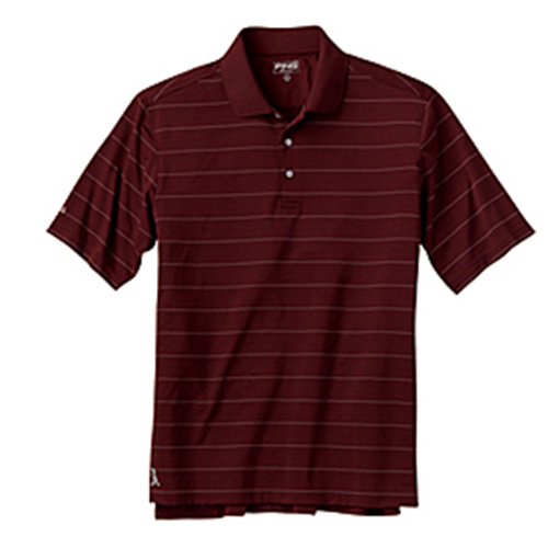 *Contrast fine line stripe with 3 button placket and flat knit collar.