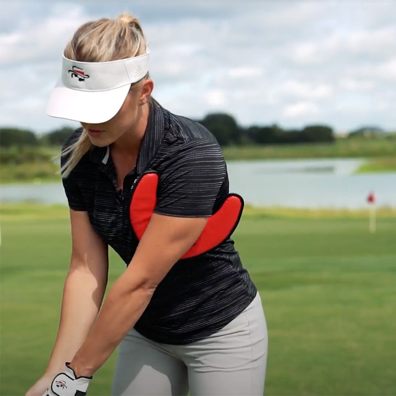 The Boomerang golf training aid can be used on either arm depending on swing requirements. To ensure the backswing is compact with no lift of the arms (as in the A Swing), wedge the Boomerang right up into the armpit of the right arm. With half swings the Boomerang will remain under the arm; a full swing, it will fall out after contact with the ball is made. To encourage the left arm to stay connected to the chest on the backswing through impact, wedge the Boomerang up into the armpit of the left arm. On a full finish it will fall to the ground.