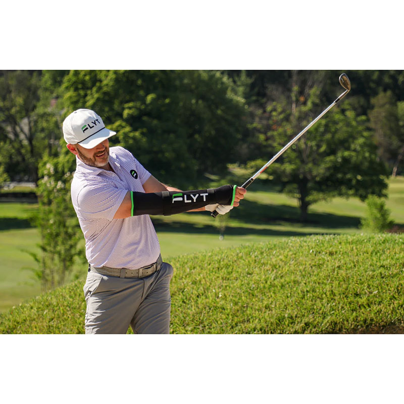 The FLYT Sleeve is designed for all aspects of the golf swing. For full swings it is best utilized on the front/lead arm (left arm for a right-handed golfer), keeping the arm straight in the back swing and reducing over rotation of the club head through the impact zone. When chipping and pitching it is best utilized on the back/trail arm (right arm for a right-handed golfer) promoting the straight arm chipping and pitching technique to minimize the influence of the hands and arms, increasing swing width and using the bounce correctly for a shallow swing every time. During the putting stroke our FLYT Sleeve can be worn on either arm to reduce movement in the right or left hand throughout the putting stroke to achieve the desired result and reduce movement. |