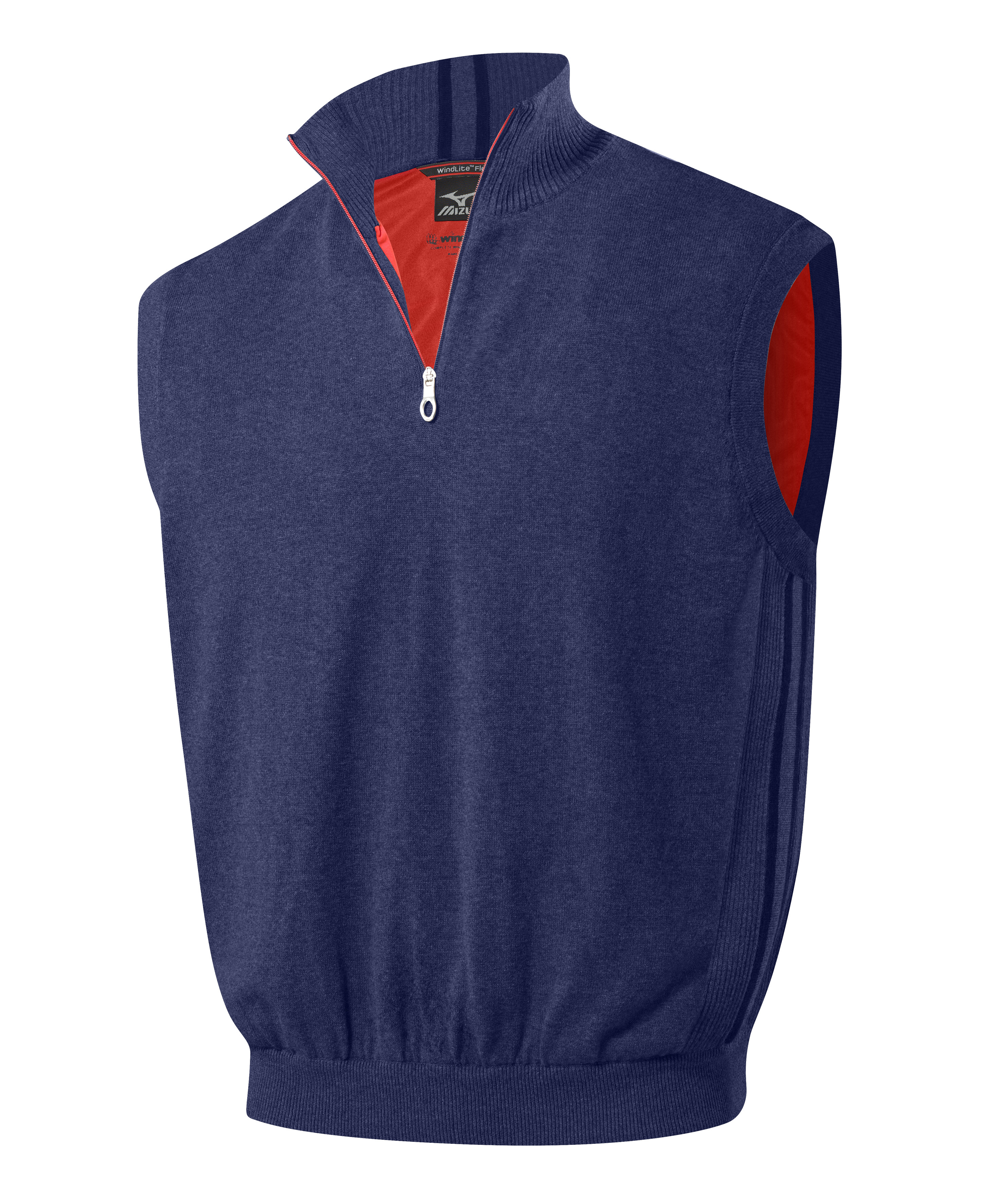 2014 Mizuno WindLite Zip Neck Vest A LIGHTER WEIGHT KNIT WITH A THINNER AND MORE FLEXIBLE DROPLINING - ALSO IN A VEST. The New Flex Sweater vest features a lightweight gauge knit using Mizuno Windlite™ technology, which provides windproof protection through an internal drop liner to maintain core body temperature. Machine washable. |