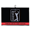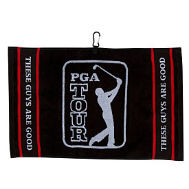 PGA Woven Jacquard Towel Woven 16" x 24" heavyweight jacquard towel, made of sheared 100% cotton velour, provides maximum absorption ad features a centrally placed carabiner that allows for easy access and keeps the towel off the ground. PGA TOUR trademark and wordmark woven into towel.