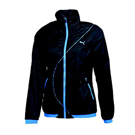 Puma Golf Novelty Wind Jacket - Womens It’s a force field, scientifically engineered to throwdown during poor playing conditions. This windproof jacket is lightweight and slim-fitting to keep your follow-through nice and smooth, enhanced by a contrast center front zip, textured elastic cuffs and waistband, and asymmetrical contrast piping. Finishing touches include an embroidered PUMA Cat on the left chest, a gold foil heat transfer PUMA Golf logo at center back neck, and an 18 Hole logo at back right shoulder.