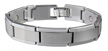"Sabona Tungsten Carbide Brushed Magnetic Tungsten Carbide is very dense, durable and scratch resistant. The brushed and polished design is guaranteed to turn some heads! A 1200 gauss samarium cobalt magnet is in each large link.   The Copper Theory Various forms of copper have been used for medicinal purposes throughout the history of mankind. Ancient Egyptian Greek, Roman, and Aztec writings record consistent medicinal uses of copper. Today as more information becomes available, alternative health care and home remedies are gaining popularity. Health publications include copper bracelets as a home remedy to possibly ease the pain from arthritis in some people who get an insufficient amount of copper from their food. One study found patients wearing copper bracelets absorbed an average of 13 milligrams of copper during a month. This could bring many people into the recommended daily intake for copper (1.5 to 3 milligrams). Copper absorbed through the skin gets into circulation very efficiently, more so than most dietary copper. Superoxide Dimutase (SOD) is one of the body�s own copper dependent enzymes that reduces pain and inflammation. The body may use copper to make more of its own SOD.       The Magnetic Theory Magnets have been uses in different cultures over the years by those who believe that magnets worn on the body promote good health. The theory is that magnet therapy is beneficial by affecting the circulatory system, the blood flow in the body. Increased circulation is beneficial because the body gets more of the nutrients it needs from the blood. Get the best of both worlds and feel the benefit of copper and magnets that can only be found in a genuine SABONA bracelet.    FAQs Q: How long should I wear the bracelet? Can I shower with it? A: Wear the bracelet constantly. Wearers report that the products provide them the most benefit when worn all the time, even at night, or in the shower. Q: Will all Sabona bracelets turn my wrist green? A: If your Sabona bracelet contains copper, it will turn your wrist green. This is the copper from the bracelet being absorbed by your body. The green mark can be removed with soap and water, or lemon juice. Sabona Executive Magnetic Bracelets do not contain copper, and will not turn your wrist green. Q: How do I clean my Sabona bracelet? A: Clean your Sabona as you would your other jewelry. Use a a good jewelry cleaning cloth to keep the outside polished and the inside clean. Q: How strong are the magnets in Sabona bracelets? A: The magnet in each tip of Sabona Copper Magnetic Bracelets measure 1700 gauss. Each magnet in a Sabona Executive Magnetic Bracelet measures 1200 gauss. Each magnet in a Sabona Professional Steel Twists measures 1200 gauss."