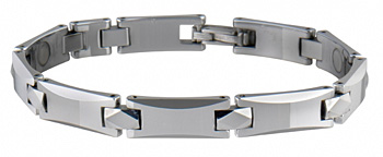 "Sabona Tungsten Carbide Slimline Magnetic Tungsten Carbide is very dense, durable and scratch resistant, and the slim design is perfect for men or women. A 1200 gauss samarium cobalt magnet is in each large link. The Copper Theory Various forms of copper have been used for medicinal purposes throughout the history of mankind. Ancient Egyptian Greek, Roman, and Aztec writings record consistent medicinal uses of copper. Today as more information becomes available, alternative health care and home remedies are gaining popularity. Health publications include copper bracelets as a home remedy to possibly ease the pain from arthritis in some people who get an insufficient amount of copper from their food. One study found patients wearing copper bracelets absorbed an average of 13 milligrams of copper during a month. This could bring many people into the recommended daily intake for copper (1.5 to 3 milligrams). Copper absorbed through the skin gets into circulation very efficiently, more so than most dietary copper. Superoxide Dimutase (SOD) is one of the body�s own copper dependent enzymes that reduces pain and inflammation. The body may use copper to make more of its own SOD. The Magnetic Theory Magnets have been uses in different cultures over the years by those who believe that magnets worn on the body promote good health. The theory is that magnet therapy is beneficial by affecting the circulatory system, the blood flow in the body. Increased circulation is beneficial because the body gets more of the nutrients it needs from the blood. Get the best of both worlds and feel the benefit of copper and magnets that can only be found in a genuine SABONA bracelet. FAQs Q: How long should I wear the bracelet? Can I shower with it? A: Wear the bracelet constantly. Wearers report that the products provide them the most benefit when worn all the time, even at night, or in the shower. Q: Will all Sabona bracelets turn my wrist green? A: If your Sabona bracelet contains copper, it will turn your wrist green. This is the copper from the bracelet being absorbed by your body. The green mark can be removed with soap and water, or lemon juice. Sabona Executive Magnetic Bracelets do not contain copper, and will not turn your wrist green. Q: How do I clean my Sabona bracelet? A: Clean your Sabona as you would your other jewelry. Use a a good jewelry cleaning cloth to keep the outside polished and the inside clean. Q: How strong are the magnets in Sabona bracelets? A: The magnet in each tip of Sabona Copper Magnetic Bracelets measure 1700 gauss. Each magnet in a Sabona Executive Magnetic Bracelet measures 1200 gauss. Each magnet in a Sabona Professional Steel Twists measures 1200 gauss." |