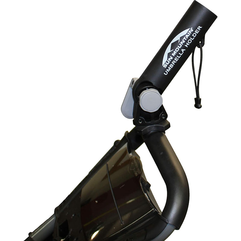 The Sun Mountain Adjustable Umbrella Holder attaches to the umbrella holder fixture on Sun Mountain carts and allows the umbrella holder to pivot back and forth to adjust the angle of the umbrella. The umbrella holder receiver tube is included.