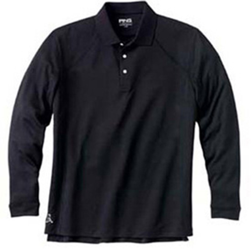 Ottoman Longsleeve polo with tonal cover stitching. PING embroidery at back yoke and Mr. PING at hem.