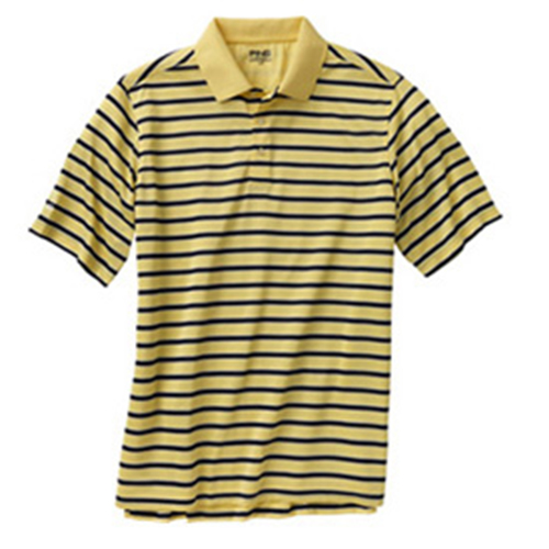 Ping Mark Golf Shirt Classic 3 color stripe with texture and jersey. PING embroidery on right sleeve and Mr. PING tab on them.