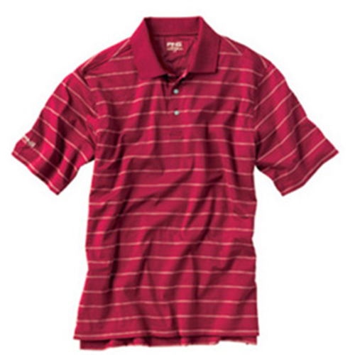 Dress stripe with a vertical drop needle stitch. PING embroidery on right sleeve and Mr. PING tab on hem.