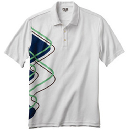 Right side sublimation. Print goes from front to back around side seam. PING heat seal on left sleeve and Mr. PING heat seal on back neck.