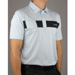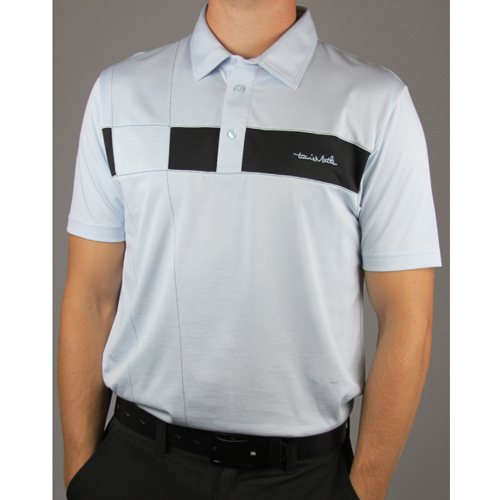 Travis Mathew Taft Shirt 3-button placket, contrast diagonal stitch lines down front, contrast cut/sew across chest, TM Script embroidery on left chest, back yoke and TM Circle Icon embroidery on lower right back