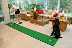 "TurfTile 8 Piece Putting Green System TurfTile from USTEK is the newest, affordable sensation in practice greens that can be used for both putting and chipping. The newly patented synthetic turf can be laid in an hour and used both indoors and outdoors with no preparation. The unique TurfTile is bonded to a polymer frame that snaps together to make any size or shape desired. The TurfTile can be expanded to fill a courtyard, backyard or shrunk to fit the corner of a deck. Disassembly for moving or storage is a breeze. The tiles are 50cm x 50cm (about 19 inches square) and come with rubber bumpers and interlocking pegs. The turf panels can be locked together to form any shape or size from a small practice green indoors to a large putting/chipping green outdoors. The TurfTile putting and chipping green is a must for teaching programs, school and recreation programs or the individual golfers who want to practice their game at home for a fraction of the cost of most greens and there is virtually no upkeep. It even makes a green-like walking surface for the pro shop floor or entranceway. Features • The 1/2 meter square turf tiles snap together easily to allow virtually any size putting green and chipping rough. • Easily installed in the home, paved courtyard, backyard lawn, balcony, or rooftop terrace. • To move the hole location on the green, just unsnap that turf tile and reposition • For more family fun, replace the hole turf tiles with croquet wickets and posts. • The selectable turf lengths allow smooth green putting or rough length chipping. • Turf tiles could be cut to fit complex shapes and perimeters. • Easily cleaned with broom or wet/dry vacuum. • Patented raised tile design cushions on hard surfaces and allows air flow and drainage when used outside. If you have any questions about this product or would like to order by phone, please call us Toll Free at 888-733-8383. We look forward to hearing from you!" |