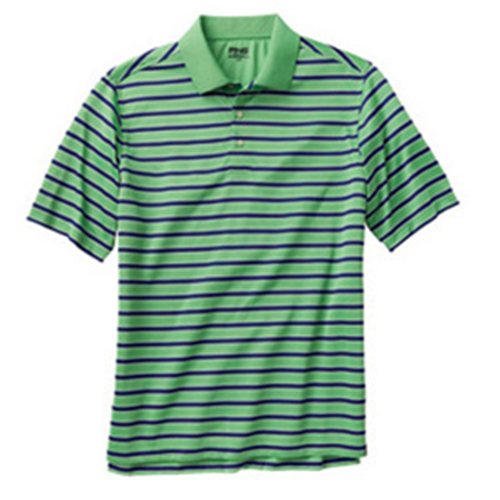 Ping Mark Golf Shirt Classic 3 color stripe with texture and jersey. PING embroidery on right sleeve and Mr. PING tab on them.