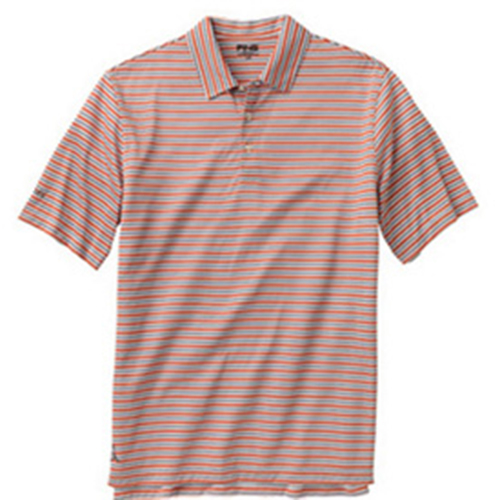 Self collar polo with multi color stripe on white ground. PING embroidery on right sleeve and Mr. PING embroidery on hem.