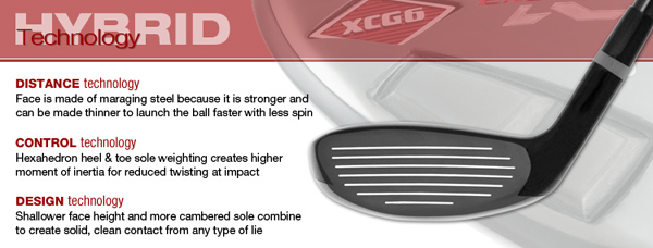 Tour Edge Exotics XCG6 Hybrid The XCG6 delivers truly extraordinary performance. Featuring a more “pear-shaped” design than its predecessor, the hybrid boasts a maraging steel cup face and a tungsten steel sole and body. Maraging steel is used in the face over stainless steel because it possesses superior strength without losing malleability. As a result, the club face can be made thinner to launch the ball with less spin and at faster ball speeds. The heavier, tungsten steel sole offers extreme heel and toe weighting that provides a high moment-of-inertia for reduced club head twisting and greater forgiveness. Making every shot easier to hit, the club has a shallow face height and more cambered sole that takes on difficult lies with ease. The XCG6’s hexahedron sole weighting moves weight back into the heel and toe areas further enhancing the playability of the club making it easy to hit, exceptionally long, and deadly accurate.