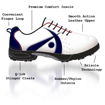 "Brisole Signature Golf Shoes Brisole Technology has been designed into the sole to assist the player in removing lightweight debris, grass and mud from the club face of your irons or other clubs when necessary. Perfect for use when away from your cart and while in play on the course or on the driving range when multiple shots are occurring requiring a quick light cleaning. Each person will find the most effective way to utilize the bristles Features • Upper: Leather • Outsole: Rubber/Phylon • Comfort: Premium Gel Comfort Insole • Waterproofing: 1 year Enhanced • Cleats: Q-loc Stinger • Dintex: Inner Comfort Liner How to: Option 1: When in your shot stance after a practice shot, to clean your club-face simply: Open the club face and position it at the side of your foot beside the bristles on your shoe. Simply raise the toe of your foot slightly and push the club-face against the angled bristles. Using motion, Slowly slide the club-face up and back against the bristles to remove the debris. Repeat this step if needed until debris is removed to satisfaction. Practice will help create the most effective use of Brisole Technology because each player is different and will discover there are many ways to use the bristles in their own style. Option 2: Put your club-face on the ground face-open in stationary position as shown. Take your foot, raise and tilt bristles toward the club face. Using the bristles, brush off debris until debris is removed using forward, up and down motion with foot. Brisole Technology is designed for quick and lightweight cleaning only. It is not meant for deep cleaning the grooves of the club face, only a means to clear debris so that a shot can be performed unabated while on course or at the range when a towel or brush is not available." |