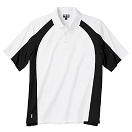 Ping Double Cross Polo - White Raglan style polo with cutting edge fabric and color-blocking. PING embroidery on right sleeve and Mr. Ping at hem. P3 Fabric Technology. 100% Performance Polyester. |