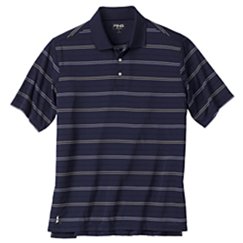 Ping Marshal Polo - Navy Classically styled polo in a bold 3 color stripe with a subtle texture. PING embroidery on right sleeve and Mr. Ping at hem. P3 Fabric Technology. 100% Performance Polyester. |