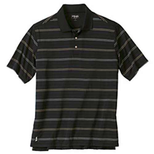 Ping Marshal Polo - Black Classically styled polo in a bold 3 color stripe with a subtle texture. PING embroidery on right sleeve and Mr. Ping at hem. P3 Fabric Technology. 100% Performance Polyester. |