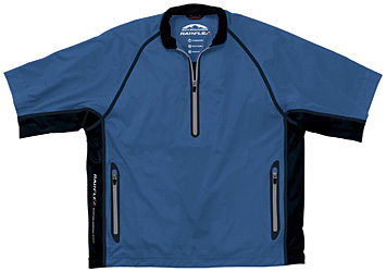 "2009 Sun Mountain Rainflex Short Sleeved Pullover-Cadet Blue/Black Closeout Features • Half-zip • Shock cord waist • YKK waterproof zippers (proven to last) • Zipper tunnels (further protect against leakage) • Storm flaps (added protection) • Stretch-taped seams (waterproof and flexible) • Tricot liner (for comfort and motion) • Waterproof side pockets • Inside chest pocket • RainShield fabric protector (repels water and stains while maintaining breathability) • Elongated Back for added protection • Locking zipper pulls (keep zipper pulls secured and out of the way) • Two-year waterproof guarantee • Stand-up Rentex collar (blocks weather, resists fraying) • Sizes M-XXL Pre Owned or Closeout item are non Returnable" |