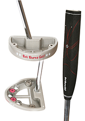 Bob Burns Roll In Putter With the Roll-In Putters, we present a line of putters with a contemporary design and a revolutionary technology. The technology embodied in these putters – certainly its most advanced and elaborate elements – is probably best illustrated by simply looking at a picture of the putter. With its 345 gram, computer milled, aluminum head and extended mallet shape, it features not only a T-shaped sightline, but a lightweight material that effectively transfers energy to the ball at a consistent rate. In its standard configuration, it lifts the ball very slightly at impact to create an immediate end-to-end roll, as well as the outstanding feel that is necessary to control your distance. Most significantly, the Roll-In Putter features seven weight portals and adjustable screws of varying masses that you may use to customize your putting game. These adjustable weight screws serve four functions. They offer a basic three-point stability system, with a dense tungsten screw in both the heel and toe, and two back weights equidistant from the center line; the result is an enlarged sweet spot. The fully weighted clubhead maximizes the moment of inertia (MOI). But you may also adjust the weights of the clubhead o compensate for the speed of the greens that you are playing on. If you tend to push or pull your putts, you can also bias the weight towards the heel or the toe to correct your problem. The special design of this putter, with its seven weight portals allows an accomplished player to move the center of gravity anywhere that they may want to. Having the center of gravity towards the back of the club reduces backspin as well as eliminates unwanted skidding. Beyond the standard weight screws, there are other screws readily available – from 2 to 10 grams each. Putting conditions are never the same, and you need a putter that can compensate for those changes. The Roll-In Putter was built to do just that. A standard option for the Roll-In Putter is a proprietary, oversized BFG (Big Fat Grip), the unique shape of which is twice as wide as it is thick, while still maintaining its paddle shape. This super jumbo putter grip weighs 205 grams. The size is more than 3X the weight, and approximately 200% larger, than conventional putter grips. The science behind the grip is simple. The additional weight of the putter grip moves the balance or pivot point towards the center of the shaft, which enhances the ideal pendulum swing, while keeping the hands quiet through impact. With Roll-In technology and a larger grip, less grip pressure yields a smooth, consistent tempo. By taking the hands from the equation, we eliminate the yips and dreaded three putts. In the end, you will notice distance control, a true roll, and great confidence. If you have any questions about this product or would like to order by phone, please call us Toll Free at 888-733-8383. We look forward to hearing from you! |