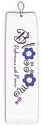 Blossoms White Golf Towel Features • 100% 145g cotton • Dimensions - 16" x 20" • Embroidered logo • Steel clasp ring • Soft plush feel |