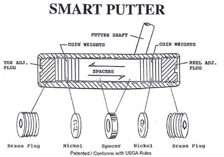 Traditional putters are often produced and marketed on the assumption that one size will fit all. We know from experience that fitting putters, as in fitting shoes, one size cannot satisfy everyone. Except for the Big Nickel Smart Putter by Au Tech. The Big Nickel Smart Putter by Au Tech is the only weight-adjustable putter that is USGA approved and patented. Let the smart putter by Au Tech give you the perfect putter fit that you desire. It is the first and only putter that you really need. It is weight-adjustable from 250 grams to over 500 grams. Choose the weight that is best for the distance control of your putt. The toe-heal weight is adjustable. Place toe-heel weight to zero in on your best putting accuracy. Sighting is extraordinarily outstanding. | Benefits |  | | | • | Program the optimum feel for best distant perception and control | | • | Configure the important toe/heel weight and balance for precision putting accuracy | | • | Find the largest sweet spot for maximum consistency | | • | Compensate for slow or fast green conditions | | • | Provide every golfer with many exciting putter options for the price of one | | • | Offer precision custom putter fitting that traditional putters cannot provide at any price. | | • | Give the professional and avid golfers the necessary edge to win the big one | | | How it works |  | |  | The Big Nickel Programmable Smart Putter by Au Tech is possibility the most innovative and effective new putter on the market today. The patented breakthrough putter design can provide each golfer with the unprecedented selection of preferred putter swing weights, putter toe/heel balance and sweet spot configurations. These programmable features will give each golfer access to the best putter feel, fit, accuracy and consistency that suit his/her own putting style and stroke to achieve the optimum putting game First determine the Best Putter Feel by inserting equal number of weights in the toe and heel position to establish the ideal Swing-weight of the putter assembly. This weight regulates the important Feel for distance perception and control by the user. It is different for each golfer, therefore, it must be accurately determine by trials on the green by each golfer. The balance of the putter head to improve accuracy can be adjusted by transferring weights from the toe position to the heel or visa-versa without affecting the Feel established above. If the tendency of the golfer is to putt to the right of the target because of his/her putting style or stroke, more weights should be transferred from heel to the toe position. Similarly, frequent putts to the left can be corrected by weight transfer to the heel. The largest sweet spot to enhance consistency/forgiveness can be accessed by placing the weights at the extreme toe/heel positions to obtain the maximum moment of inertia. The innovative Smart Putter also allows a more central weight placement for users who prefer such a location. Simply adjust the number of spacers at the center to increase or decrease the size of the sweet spot desired. Weights can also be added or removed to compensate for the speed of the green. Weights should be added or reduced equally at the toe and heel positions so that the balance is not affected by the change. More weights can be added to accommodate a slow green. Weights can be reduced accordingly to manage a fast green. This change readjust the Feel to manage extraordinary green conditions encountered by the golfer at different courses and in various geographic locations. Please note that USGA rules permit changes to be made prior to the start of a round. No changes are allowed during a round of golf in tournament play. The weight plugs should be tightened firmly but not excessively before the beginning of play. As described above the Smart Putter clearly adds a new dimension to accurate putting that is not previously available to golfers, it is virtually like having a complete line of putters from which to select the best for each golfer. The Big Nickel Smart Putter by Au Tech conforms to USGA rules and is patented. Heavy brass toe/heel cap screws give the highest MOI. Get the Big Nickel Program-able Smart Putter by Au Tech to enhance your putting game. Call or order now for a limited time introductory offer. The Smart Putter is weight-adjustable from 250 grams to over 500 grams. Choose the weight that is best for you by experience or trial. Toe-heel weight is uniquely adjustable. Place toe-heel weight to zero in on your best putting stroke. Sighting is extraordinarily outstanding. Shaft placement is optional. | | | |