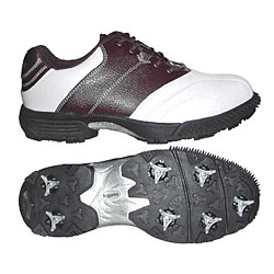 "Brisole Classic Executive Golf Shoes Brisole Technology has been designed into the sole to assist the player in removing lightweight debris, grass and mud from the club face of your irons or other clubs when necessary. Perfect for use when away from your cart and while in play on the course or on the driving range when multiple shots are occurring requiring a quick light cleaning. Each person will find the most effective way to utilize the bristles Features • Upper color, White with Brown Saddle • Upper Material: Full Grain with Sport Action Leather Saddle and Heel • Cleat: Q-lok Stingers • Comfort: Enhanced • Waterproofing- 1-year Warranty How to: Option 1: When in your shot stance after a practice shot, to clean your club-face simply: Open the club face and position it at the side of your foot beside the bristles on your shoe. Simply raise the toe of your foot slightly and push the club-face against the angled bristles. Using motion, Slowly slide the club-face up and back against the bristles to remove the debris. Repeat this step if needed until debris is removed to satisfaction. Practice will help create the most effective use of Brisole Technology because each player is different and will discover there are many ways to use the bristles in their own style. Option 2: Put your club-face on the ground face-open in stationary position as shown. Take your foot, raise and tilt bristles toward the club face. Using the bristles, brush off debris until debris is removed using forward, up and down motion with foot. Brisole Technology is designed for quick and lightweight cleaning only. It is not meant for deep cleaning the grooves of the club face, only a means to clear debris so that a shot can be performed unabated while on course or at the range when a towel or brush is not available." |