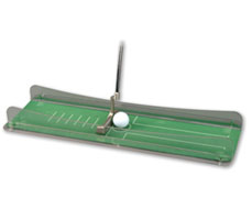 "Clear Track The CLEARTRACK Trainer provides both visual and mechanical guidance with an absolute minimum of visual distraction, thus encouraging the eyes to stay focused on the ball. The Side Rails, made of durable, super clear PETG plastic, establish the channel for mechanical guidance. (Make it CLEAR..... let it disappear!) The Locator Floor, made of tough polystyrene with green nylon flocking, provides a smooth, realistic putting surface for the ball plus visual guidance..... and the small hole in the Floor locates the ball on the centerline of the channel. Just move the ball to the hole with your putter and, when you see the ball wobble into place, you know it is perfectly centered. THIS IS IMPORTANT! Remember.... if a guide is properly fitted to a putter, and the ball is not on the centerline, it is impossible to contact the ball with the "sweet spot" in the putter face. The visual guidelines are INSIDE the channel, on the ball and stroke paths, to help keep the eyes where they should be. The ring around the ball locating hole provides a reference to make sure your eyes are directly ABOVE THE BALL By detaching the Locator Floor from the Side Rails you can use the Floor alone and have just visual guidance. (Like taking the training wheels off a bicycle!) Subtle or substantial adjustment of channel width is really simple and quick. No need to disassemble to install or remove fixed-dimension inserts. Easy to roll the ball into place no crossbars in the way. THE COMPACT SIZE AND LIGHT WEIGHT OF THE CLEARTRACK MAKE IT EASY TO CARRY, PLACE AND AIM CLEARTRACK is moisture and UV resistant, suitable for both indoor and outdoor use. The Target Cup, a white disc with holes like the bottom of a cup, is included to provide an aiming point for the CLEARTRACK. It is ¼" smaller in diameter than a regulation cup, so the holes out on the golf course look LARGE! THE MANY DISTINCTIVE FEATURES OF THE CLEARTRACK COMBINE TO PROVIDE A REALLY CONVENIENT WAY FOR ANY GOLFER TO BECOME A GREAT PUTTER. Features • Mechanical and visual guidance • Fits putters 3 7/16" to 5 3/16" • Self-centering ball placement • Minimum visual distraction • Target Cup for proper aim • Both ends wide open • No assembly required If you have any questions about this product or would like to order by phone, please call us Toll Free at 888-733-8383. We look forward to hearing from you!" |