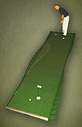 "Extreme Greens Competitor Model The Competitor is the most versatile of the Extreme Green line of adjustable practice putting greens. It provides the same features as our larger models and will fit anywhere. It provides the same features as our larger models. The Competitor still allows the practice of 15 foot putts with left to right double breaks, but at a more modest price. This model is also one of the easiest to move to different locations for special events or rental opportunities. Features • 4' x 17' Extreme bed support • 4'x17' Artificial Turf • 2 cups with flags • 1 rough grass segment How it works The Extreme Green is made up of patented modular segments that are adjustable by sliding the side support wedges in or out to change the slope. The green can be set up on any level surface and are designed and constructed for years of maintenance free use. The Extreme Green is assembled by interlocking individual segments together. To create the desired length of your green just link the right amount of segments together. A 20 foot green will need 36 segments each segment being 6.6 inches wide. If one hole on either side is desired then two segments with holes are needed. Place the holed segments in the 5th segment on each end. When all the segments are in place then the turf can be rolled out on top. First place the cups into the holes then roll the turf over the bed. Then mark the top of the cups at three points with a black felt pen which will leave an imprint on the back of the turf. Last, place the cup on the imprint on the back of the turf and cut around the cut with a razor knife to finish. Easy Set up and adjustment The Extreme Green is made up of patented modular segments that are adjustable by sliding the side support wedges in or out to change the slope. The green can be set up on any level surface and are designed and constructed for years of maintenance free use. The Extreme Green is assembled by interlocking individual segments together. To create the desired length of your green just link the right amount of segments together. A 20 foot green will need 36 segments each segment being 6.6 inches wide. If one hole on either side is desired then two segments with holes are needed. Place the holed segments in the 5th segment on each end. When all the segments are in place then the turf can be rolled out on top. First place the cups into the holes then roll the turf over the bed. Then mark the top of the cups at three points with a black felt pen which will leave an imprint on the back of the turf. Last, place the cup on the imprint on the back of the turf and cut around the cut with a razor knife to finish. Standard Features • Units link together to create an adjustable multi-slope putting green • Commercially durable all-weather construction • Anodized aluminum and high impact plastic components • Suitable for residential or commercial applications Chipping Mat Options Premier Chipping Matt • Includes 40"x 40"x 4" foam mat with 1 1/2 " chipping grass. • Best simulates chipping from real grass onto green. $250 Executive Chipping Matt • Includes 20"x 40"x 4" foam mat with 1 1/2 " chipping grass. • Best simulates chipping from real grass onto green. $150 If you have any questions about this product or would like to order by phone, please call us Toll Free at 888-733-8383. We look forward to hearing from you!" |