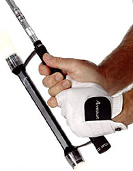 EZ Plane Trainer Ben Hogan referred to the swing plane as a "three-dimensional road map" for the golf swing. It's that invisible, imaginary, sloping, circular path that is carved in the air as the best golfers make their swing. Understanding this concept is vital if you want to develop a perfect golf swing and, of course, hit great golf shots. All professional golf instructors endorse the swing plane concept and many use the "invisible sheet of glass" analogy to represent the swing plane. Think of it as a channel in space, several inches thick in which the club travels during the key parts of the swing. The golf swing is "on-plane" as long as either end of the club is pointing at the target-line throughout the swing. The target-line is the line that extends from your target back to your ball and beyond. If we project a beam of light from either end of the golf club, parallel to the shaft, it would trace the target-line throughout the entire swing. If either light beam (head-end or grip-end) strays from the target-line it would indicate being off-plane and would suggest corrective action be taken to improve the swing. By seeing your own swing plane in action you could rapidly develop the perfect golf swing. The EZ Plane Swing Trainer makes your swing plane visible to you while you are practicing. The EZ Plane Swing Trainer projects highly focused beams of light from both ends of any golf club. With the high visibility target-line supplied, you will be able to see exactly where your club shaft is pointing throughout the entire swing. The swing trainer works with any golf club ... drivers, woods, irons and putters. Nothing to install - no moving parts. Simply place the EZ Plane Swing Trainer in your hands and pick-up the club of your choice and you are ready to swing ON PLANE! |