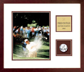 Fred Couples -- Autographed Golf Ball Series Authentically hand-signed ball, with photograph, and engraved brass plate. Fred Couples pictured here at the 1992 Masters, blasts out of a bunker on the 10th hole. He went on to win the Masters that year. Among his many achievements, Couples won the 1984 Tournament Players Championship, while carding a then course record 64 at the TPC Sawgrass, and repeated in 1992, with a new TPC course record at 63. Couples won the 1992 Arnold Palmer award as the leading money winner on the PGA Tour. He is feared in match play and was a member of the 1989, 1991, 1993, and 1995 U.S. Ryder Cup teams, the 1994 and 1996 U.S. Presidents Cup teams and teamed with Davis Love III to win a record four consecutive World Cup Golf Titles. Authenticity If you have any questions about this product or would like to order by phone, please call us Toll Free at 888-733-8383. We look forward to hearing from you! |