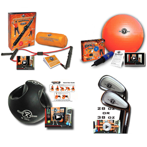 Golf Gym Complete System The Complete GolfGym System allows golfers to fully maximize their golf-specific workout routine. It contains all the elements necessary for increasing upper body strength, improving balance and posture, and strengthening the core muscles. The complete package includes these five products: The PowerSwing Trainer Masters Edition is a unique training and conditioning tool designed to develop proper swing habits and muscle memory, improve club control and shot accuracy, build strength to add distance, and develop better balance and posture. The Complete GolfGym System contains the Masters Edition which includes a ProPerfect training grip, three latex PowerCords (light, medium and heavy resistance), door attachment, instruction manual, Quick-Start online video and a convenient carrying bag. Golfers have a choice of either the golf-balanced Club 38 (about 2.4 pounds) or Club 28 (about 1.75 pounds) weighted training clubs as part of the Complete GolfGym System. The clubs are proportionately weighted, and the full length of a standard 7 iron, with the overall weight distributed the same as a traditional club. This makes the Club a perfect warm up tool for golfers prior to their round or in a training regiment. The GolfGym Balance Ball is a premium quality 65cm, 2 ply, non-burst balance ball. Includes website for Quick Start online video, Quick Start User Manual and a portable air pump. The Balance Ball online video features PGA Tour Coach Joey D, who guides golfers through step by step each of the exercises that will improve flexibility and rotation strength. These are the same exercises that he employs with his players on the PGA Tour. All of these GolfGym tools are being used on the PGA, Nationwide and the Champions Tours in the Fitness trailers that follow the Tours to every event.