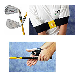 Bob Burns - Training Aid 3 Pack Bob Burns - Training Aid 3 pack. The No Chicken Wing torso strap, The Grip Lock Glove and No Bananas Weighted gorilla club. A package guaranteed to truly elevate your game. The Chicken Wing Torso Strap This USA made product made from high-tensile strength and durable elastic is designed for heavy practise use. It corrects multiple swing faults, most commonly the "chicken wing" of the left arm, which occurs when the player pushes the left elbow towards the target before allowing the club to release on the through swing. Beteween the silver buckles detach the two velcro straps. Streach the aid around your back and then across your chest; re-attach the velcro straps high in the center of your chest. The product logo should appear in the middle of your back. It should fit tightly but comfortably. Depending on your swing problem, detach the Velcro strap under your right and/or left armpit and slip your arm through the loop. The straps are color-coded according to size. The Grip Lock Glove The 100 percent leather Grip Lock Glove fits on the right hand for a right handed player. With the tubular elastic loop sitting on your palm, thrust your thumb through the aperture, then secure the velcro clasp over the top of your wrist. Holding a club by the grip in your left hand, slide the left thumb through the loop and then place both hands properly on the club. This training aid should improve your grip, help you achieve a proper hinge on the backswing and eliminate a flying right elbow, thereby ensuring the right hand applies the proper pressure on the left thumb to direct the club on-plane. This aid should particularly help the mid to lower handicap player. The No Bananas Weighted Gorilla Club The new No Bananas Gorilla Club is designed all golfers and extremely beneficial. Looking to improve your swing speed, accuracy and or flexibility. This weighted practice club is 32”, shorter than most putters and designed for both indoor and outdoor use. Additional flexibility and strength are benefits developed from consistent use. Do you want to create additional power, who doesn’t? You can do so in your warm up, range practice, at home and during the course of play.