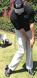 PivotforPower THE PivotForPower works because it teaches the transition weight shift move. Golf pros teach students to propel the clubhead to the ball along or from inside the target line by clearing his hips before impact. Students learn to lead their downswing with lower body, their hips turning toward the target before their shoulders and arms come around. A golfer must PLANT his front leg post by shifting his weight to his front leg. As he shifts weight and posts, his back foot heel raises. Earlier is better. Early weight transfer is the defining difference between pros and amateurs. Ben Hogan said when he made this video clip that starting the downswing with lower body is The most important thing in the golf swing. Then he demonstrates the transition weight shift in this video clip. Ben Hogan wrote in Five Lessons page 90 (paraphrasing) that we can focus on only one or two key movements during the downswing. He wrote, The HIPS INITIATE THE DOWNSWING. They are the pivotal element in the chain action. Starting the downswing with hips practically MAKES the downswing. It creates early speed. It transfers the weight from the back to the front foot. It takes the hips out of the way and gives your arms plenty of room to pass. Bobby Jones wrote extensively about this in his book, Bobby Jones on Golf pp 145. The duffer cannot do better than to resolve never to permit his club head to cross the projected line of flight in back of the ball. and The hips must be shifted quickly toward the front along the line of play.. From SLAP Swing Like A Pro, pp. 102, The transition move is what gives a great golf swing its undeniable sense of rhythm, grace, and flow. You'll hit the ball farther than you ever thought possible, with less effort than you probably are applying now. Although the main purpose of the transition weight shift move is to produce power, it has the nice residual effect of allowing the correct swing path to occur. One of the main reasons most golfers fade or slice is because they're unable to move the lower body out of the way of the upper body and club. The transition move serves to remove this obstacle by initiating an early power body shift toward the target. |