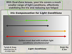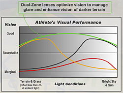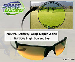 PeakVision Sports developed the patented Dual-Zone filtration that utilizes different filters in two zones of a sunglass lens. In the upper zone, neutral-density gray filtration eliminates overhead glare from the sun and enhances distance perception. Through precise color and light management technology, PeakVision Sport's upper gray zone gradually transitions into an amber lower zone which enhances a golfer's ability to read the topography of the green. For skiers, the upper gray zone transitions into a vermillion lower zone.