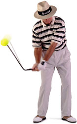 Swing-eeZ Golf Trainer Swing-Eez is a surprisingly simple training aid designed to improve your tempo and rhythm. Swing-eeZ is a soft foam ball attached to a regulation golf grip by rubber tubing. Swing-eeZ is designed to help ingrain a rhythmic swing and to eliminate "hitting from the top". In addition, your swing plane is apparent due to the visibility of the bright yellow ball as well as where the ball touches your body on the back & through swings. The Swing-Eez is lightweight and flexible so that it may be stored in your golf bag for a pre-round warm-up. If you have any questions about this product or would like to order by phone, please call us Toll Free at 888-733-8383. We look forward to hearing from you! |