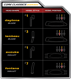 TaylorMade Core Classic Lambeau Putter | Features |  | | | • | Four time-honored shapes incorporate traditional lines and sole widths | | • | Softer AGSI®+ technology insert with 14 grooves positioned closer together promotes better touch and more efficient spin for a smoother roll | | • | 304 stainless steel construction with a Tuscan nickel finish offers a sleek and beautiful look | | | Specs |  | | | Model | Daytona | Lambeau | Fontana | Suzuka | | Description | Daytona Blade Shape | New Lambeau Blade Shape | Classic Mallet Fontana | Classic Mallet Shape | | AGSI®+ | Yes | Yes | Yes | Yes | | Head Material | Stainless Steel | Stainless Steel | Stainless Steel | Stainless Steel | | Finish | Tuscan Nickel | Tuscan Nickel | Tuscan Nickel | Tuscan Nickel | | Shaft | Step Straight | Step Straight | Double Bend | Step Straight | | Hosel | #1 in a two position | #3 in a three position | #7 in a two position | #1 in a two position | | Offset | Full Shaft | 1/2 Shaft | 1/2 Shaft | Full Shaft | | Length | 33, 34, 35, RH, and 35 LH | 33, 34, 35, RH | 33, 34, 35, RH | 33, 34, 35, RH | | Left Hand | Yes | No | No | No | | Headweight | 345g | 345g | 345g | 345g | | SW | D 6-8 | D 6-8 | D 6-8 | D 6-8 | | Toe Down | 48° | 56° | 0° | 30° | | Loft | 3.5 | 3.5 | 3.5 | 3.5 | | Lie | 70 | 70 | 70 | 70 | | Grip | New Winn Tour Bird | New Winn Tour Bird | New Winn Tour Bird | New Winn Tour Bird | | | | Technology |  | | | | |
