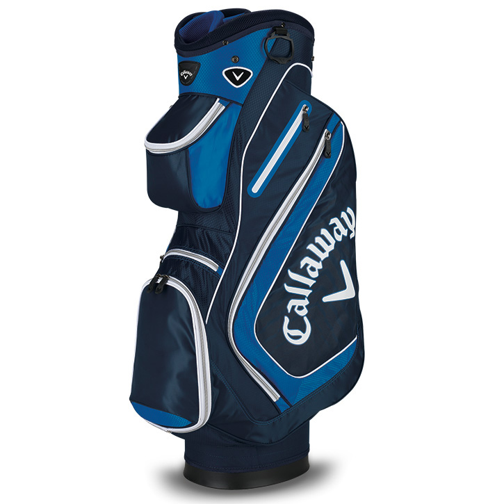 2015 Callaway Chev Cart BagAs Callaway's lightest cart bag, the Chev Cart is heavy on features with a 14-way top, velour lined valuables pocket and multiple full length apparel pockets.