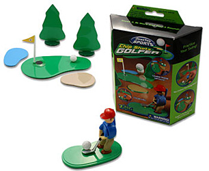 Chip Shotz Golfer A magnetic ball hit by a spring loaded golfer lands on metal greens, bunkers, water hazards and trees. This game is so much fun, it hasn't left our conference room table. |