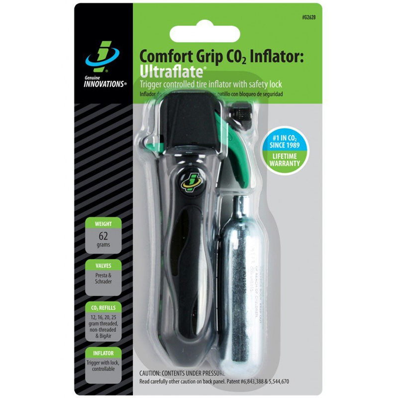 The Ultraflate Plus accepts ALL Genuine Innovations cartridges including Big Air! Trigger lock prevents accidental activation. Push-on for Presta, screw-on for Schrader. Comes w/ one 16g non-threaded CO2 cartridge.