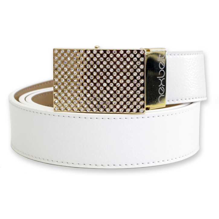 White lightly textured leather strap with a brilliant gold buckle with hand laid rhinestone gems.  Buckle flips open to reveal a hidden marker.