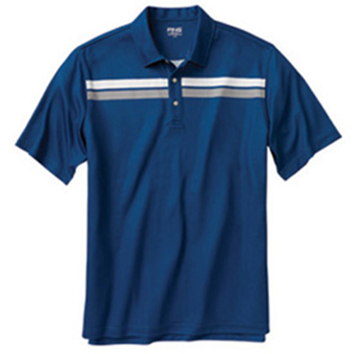 Ping Greenie Golf Shirt - Mens Two color stripe sublimation. Stripe is on the front and back of the shirt. PING heat seal on left sleeve and Mr. PING heat seal on back neck.
