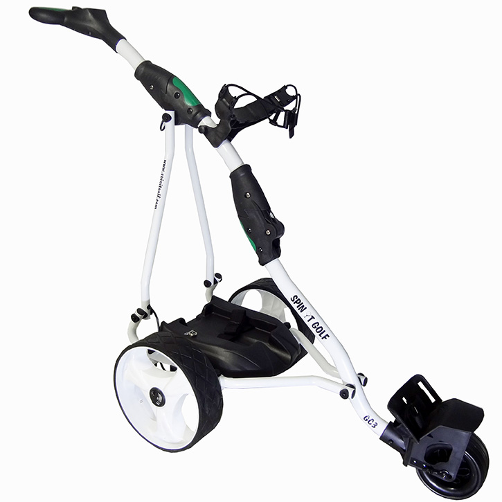 Spin It Golf Easy Glide Electric Push CartIntroducing the Easy Glide electric golf caddy. This innovative electric golf caddy features a USB connection on the underside of the handle allowing you to charge a smart Phone or GPS unit from the onboard power supply. Now you can comfortably use your GPS app on your smart phone without the fear of running your battery dead. The GC3 is a walk behind model that is operated from the controls in the handle and features a digital readout, manual variable speed, as well as the preset auto-distance function with options of 10, 20 or 30 yards. Comes complete with battery, battery charger, scorecard holder, umbrella holder, GPS holder and drink holder.