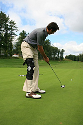 There are golf articles that warn against early extension (straightening) of your up target leg in the golf swing. Using The Anchor training aid to help conceptualize this feeling in slow motion is acceptable. This golf training aid is not designed for hitting golf balls with full swings on the up target leg. In other words, it is not intended for right handed golfers to use it on the left leg and left handed golfers to use it on the right leg for full swing use.