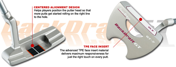 Tour Edge Back Draft GT Putter These deep center of gravity putters feature a tpe face insert for increased responsiveness and a true touch. The Backdraft GT putters feature a variety of designs, from the most traditional to high-MOI mallets - and all feature a newly designed alignment aid. The aid, which is the same width as a golf ball, features a centered sight line so golfers can be confident that they've got the right set up. The advanced TPE face insert delivers a responsive feel at impact, providing the ultimate touch, even on those delicate putts. The Backdraft GT putters feature a Winn-style midsize pistol grip and are available in seven hot styles and come with a Backdraft GT putter cover..