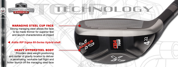 Tour Edge Exotics CB4 Tour Hybrid Designed for better players, the Exotics CB4 Tour hybrid has a deeper face and higher center of gravity designed to produce a more penetrating ball flight. In addition, the smaller head size and added face progression combine to allow for greater workability. The result is that players will see great results from the tee, fairway, rough, and even sand. The Tour Edge Exotics CB4 Tour hybrid combines a maraging steel cupped face with a hyper-steel body. The stronger maraging steel allows for a thinner face that has greater malleability for enhanced feel and distance. Completely integrated with the head design, the Exotics CB4's new Boomerang face technology features v-shaped boomerangs which allow engineers to vary the thickness of the face. The result of this technology is outstanding distance and control, even on off-center contact. Exceptional performance also comes courtesy of the Aldila RIP Sigma 80 Series hybrid shaft. One of the most popular shafts on Tour, RIP technology weaves inner 45-degree angle graphite plies on the outside and inside of the shaft tip. This increases hoop stiffness and creates lower torque, increased stability, and exceptional tip stiffness control. The Tour Edge Exotics CB4 Tour hybrid delivers the ultimate in distance and control. Take control of your game with this player's weapon.